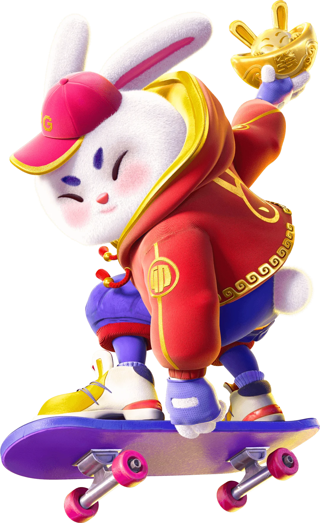 O Jogo do Coelho possui o recurso do Símbolo Wild, que substitui quaisquer outros símbolos que você precise para formar uma combinação vencedora (exceto o símbolo de Scatter). No Fortune Rabbit, o símbolo Wild é representado pelo irreverente coelho skatista do jogo.